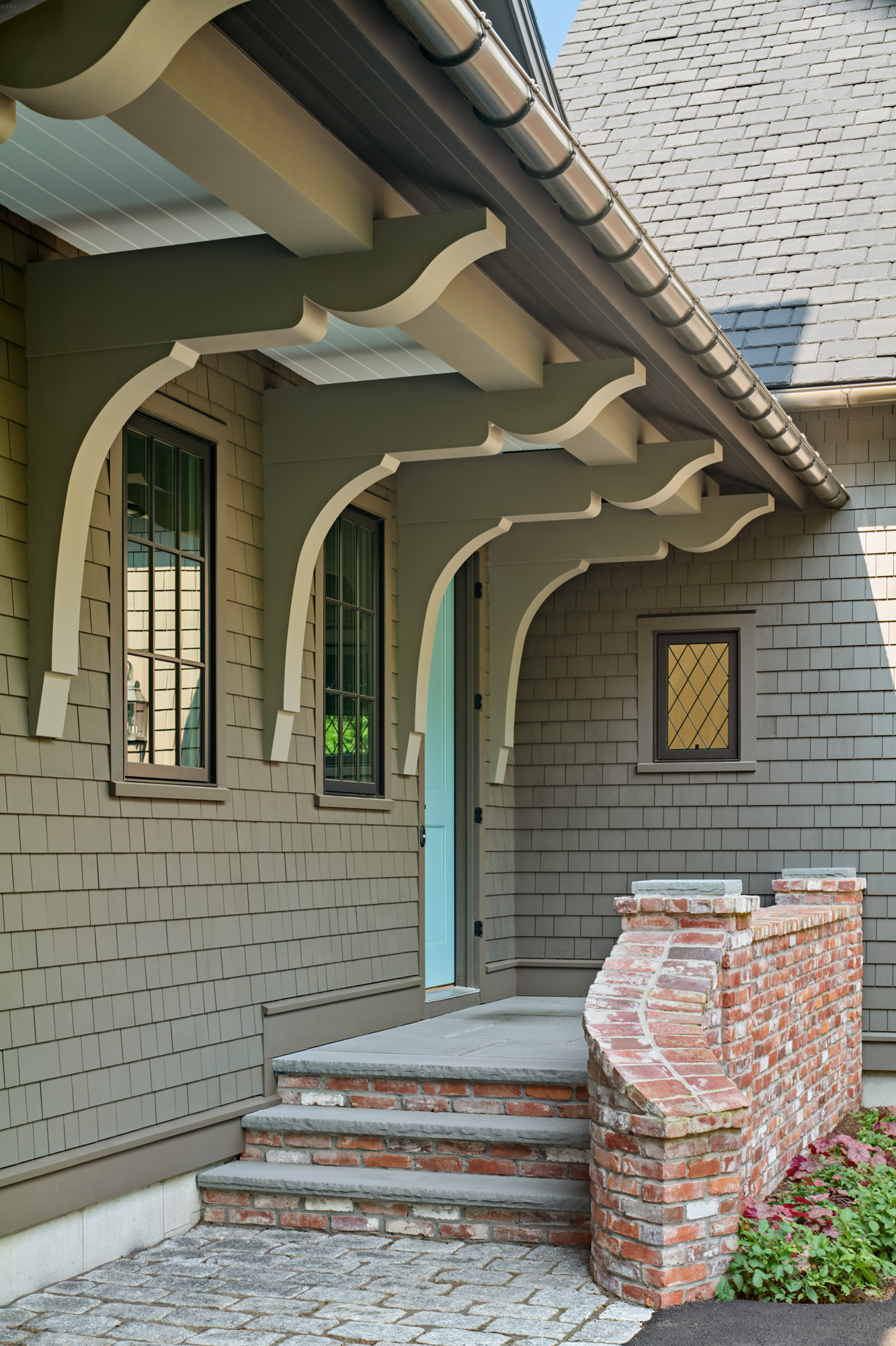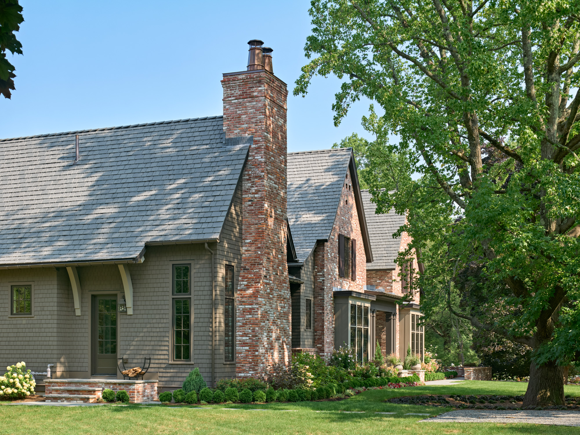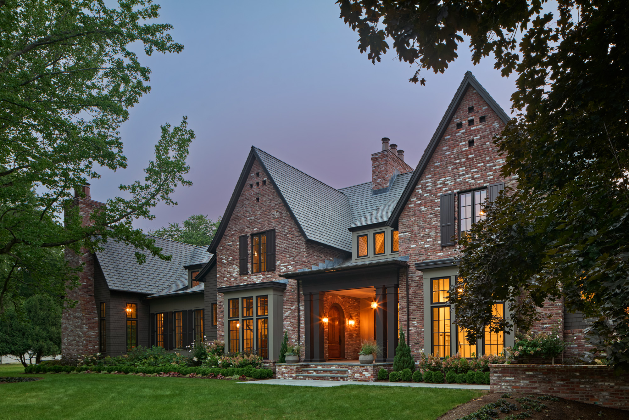Drawing inspiration from the iconic Tudor style, the exterior of the home features steeply pitched gables, decorative timber framing, and an asymmetrical layout that evokes the charm of Old World craftsmanship. However, the design extends beyond mere nostalgia, blending these historic elements with clean lines and a carefully considered material palette. The façade incorporates a mix of stone and stucco to add depth and texture, while large windows bring in natural light and provide a visual connection to the landscaped surroundings.